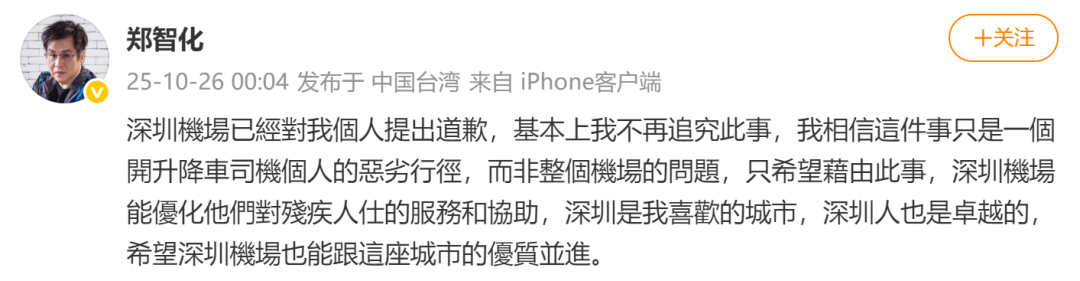 26日,郑智化在个人社媒账号再度就深圳机场服务一事发文: