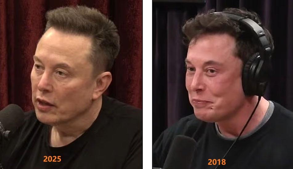 马斯克第一次出现在《乔·罗根秀》时,是2018年,当时他看上去满面红光,无论是眼神还是皮肤,都比现在看上去年轻得多。