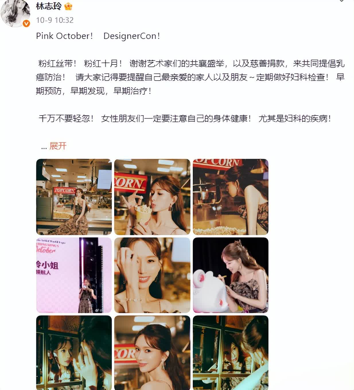 10月9号,志玲在自己的社交账号上发布了一组九宫格照片,内容是她参加活动时候拍的。