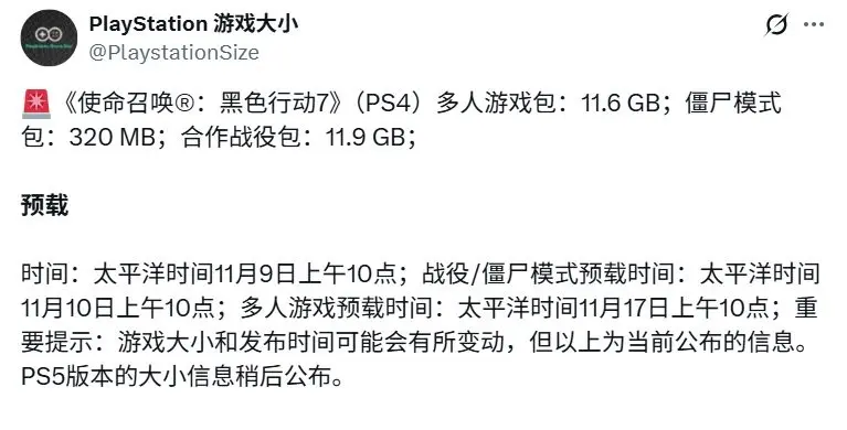 游戏资讯账号PlayStationSize通过设计平台披露了动视Treyarch即将推出的第一人称射击游戏《使命召唤:黑色行动7》预载日期与下载容量。