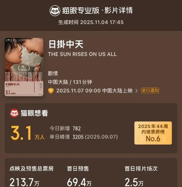 这次获奖的《日掛中天》讲的是两个分开很久的人在南方小城重逢,结果最后结局很悲剧。这部电影是蔡尚君导演的,还有张颂文、冯绍峰一起演。