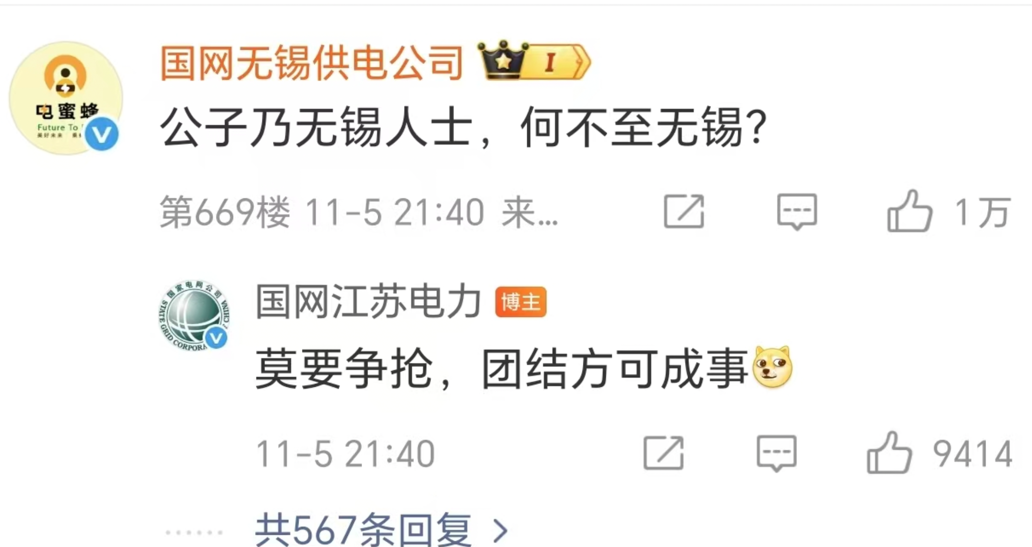 在江苏电力发布上述贴文后,国网无锡供电公司评论区留言“抢人”。