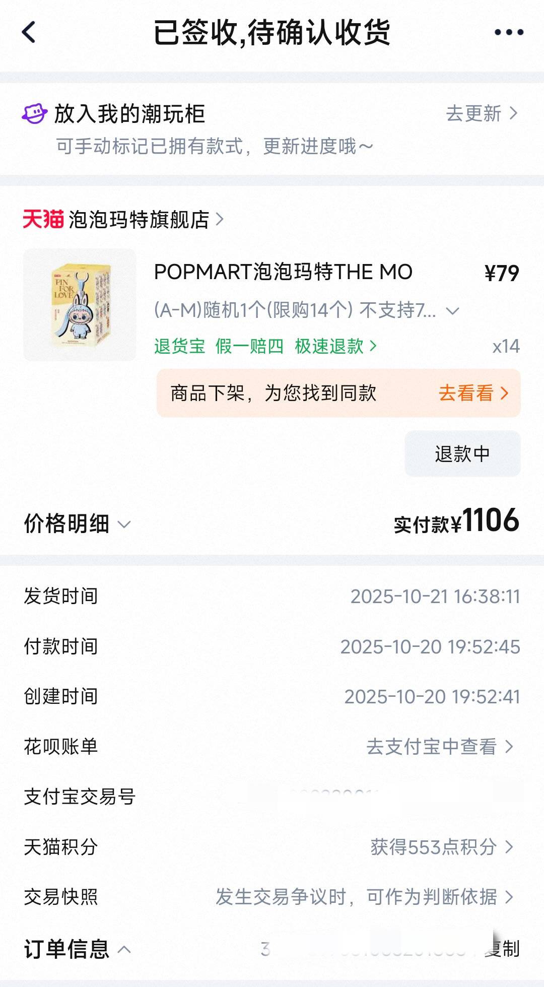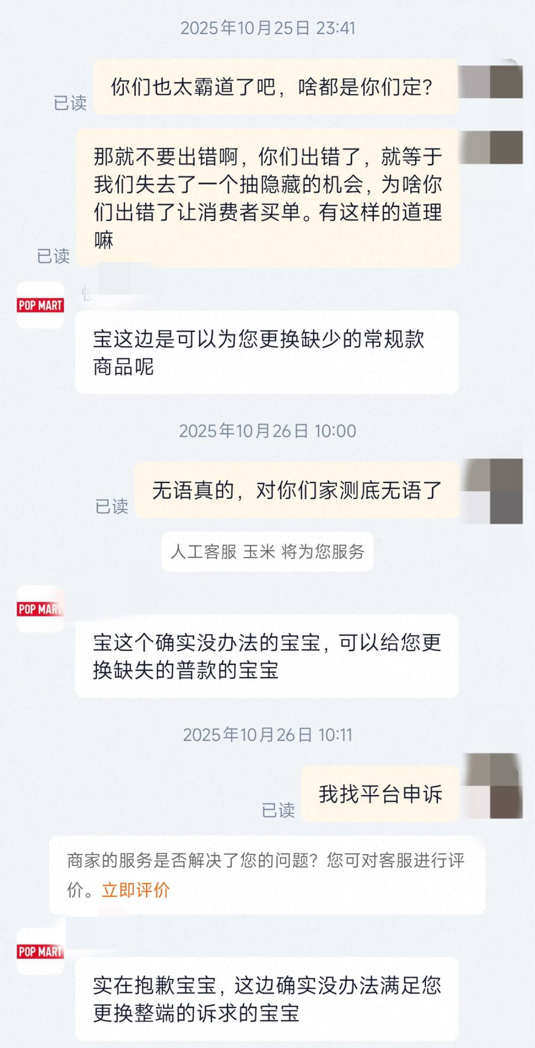 多次投诉后,11月5日,泡泡玛特售后联系上李女士,提出可以换整端,但拒绝了李女士退货的要求。“是他们的商品出现了问题,我现在已经不想要了。”