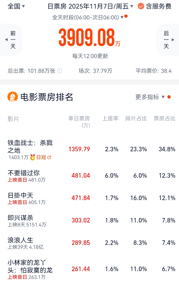 11月7日,《铁血战士:杀戮之地》《不要错过你》《日掛中天》《小林家的龙丫头:怕寂寞的龙》等新片上映,大盘票房反弹到3900万元以上。