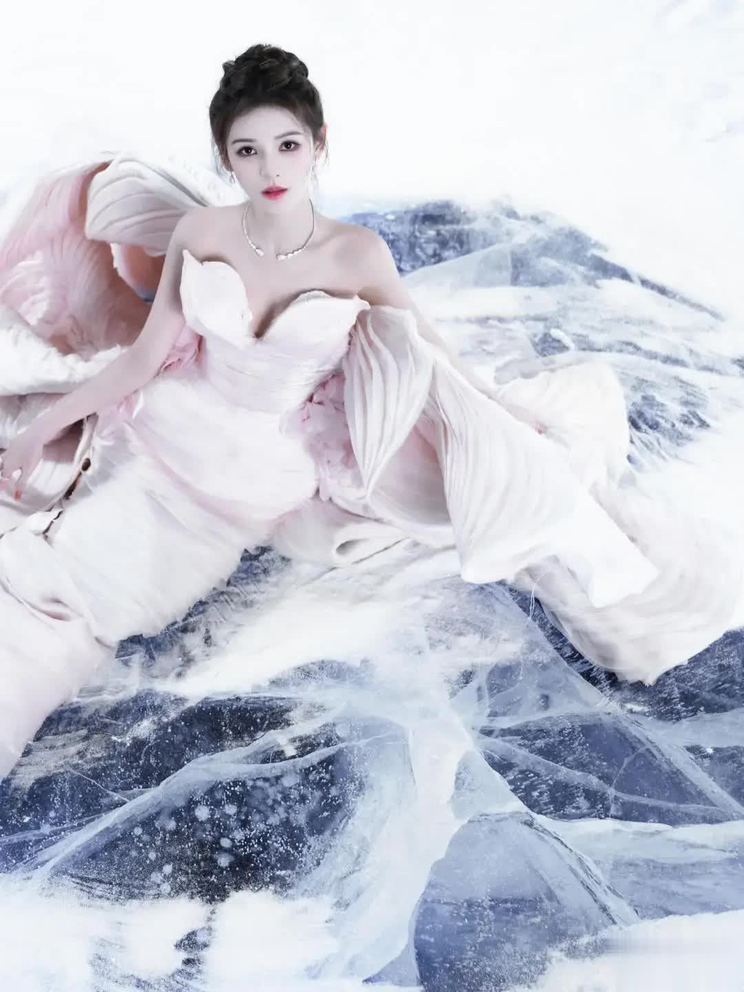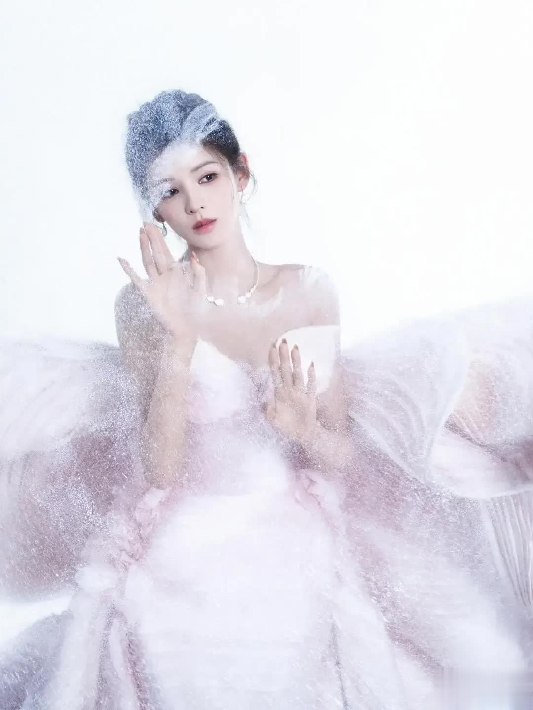 她身着中国设计师Cheney Chan 2024秋冬高定系列中的梦幻之作,宛如从冰雪童话中走出的仙子,将“清冷与柔美”完美融合。整件礼服以层叠的薄纱与立体褶皱精心打造,模拟出花瓣在寒雪中倔强绽放的瞬间,轻盈飘逸又不失力量感。背部点缀的粉色蝴蝶结,为整体造型注入梦幻气息,令人过目难忘。