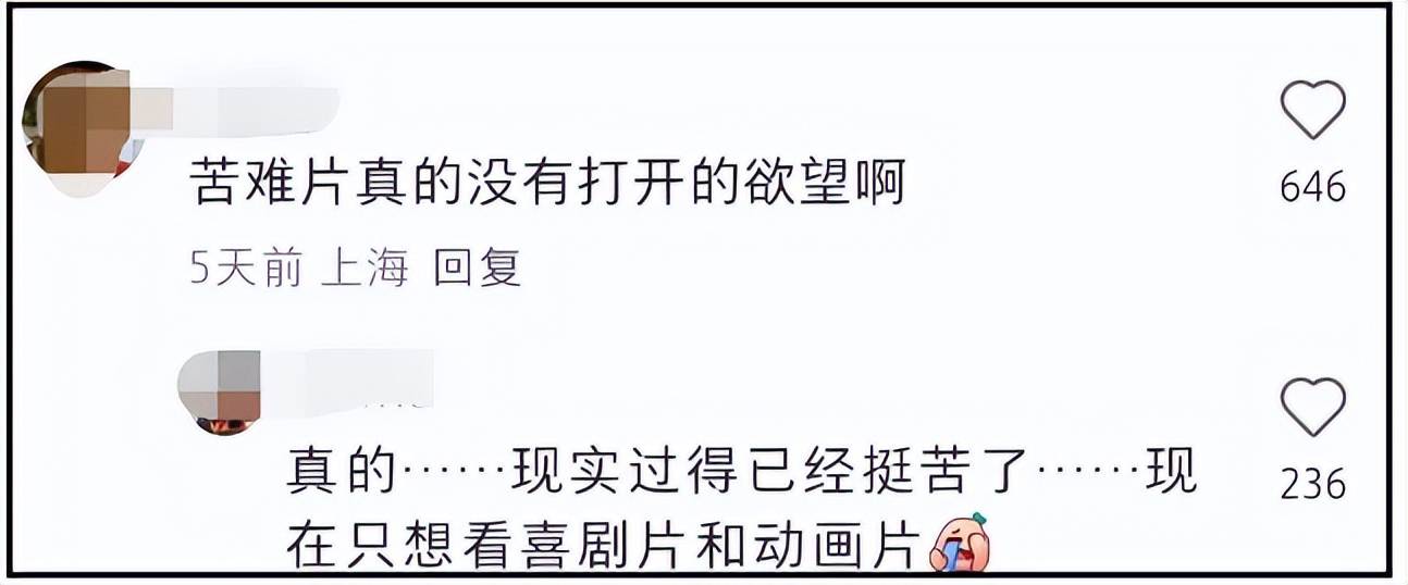 确实如此,这些年文艺片在市场上确实已经不吃香,哪怕在国际上斩获奖项的电影,在国内的票房都不理想。时代的改变,市场的竞争,让观众有了更多选择。这些年,大家明显只愿意给能够给自身带来情绪价值的电影买单。如果影片传递的内核确实太沉重,也就难怪票房不高了。