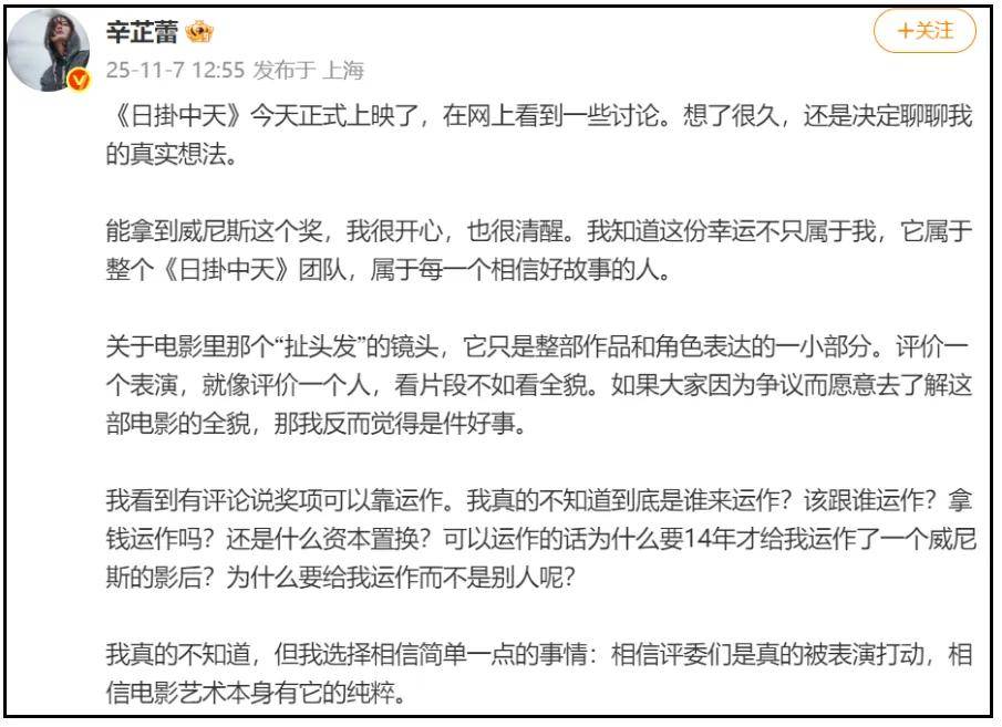 看到郝蕾的质疑,辛芷蕾本人也很快出面回应,称威尼斯奖项属于团队,还解释了对方提到的“扯头发”镜头,并回击了“奖项运作”的言论,全篇感激团队,回呛郝蕾,发言底气十足。