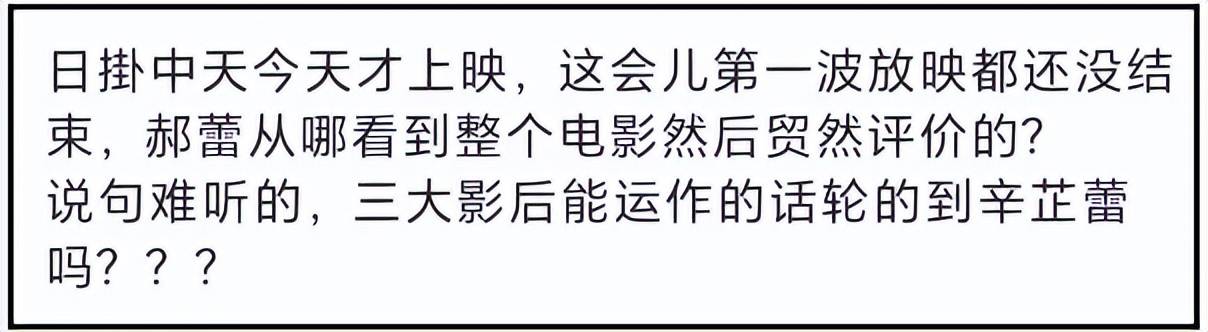 然而就在该片上映当天,网络却曝出郝蕾的朋友圈截图,她在文中不仅扫射各大电影节,还内涵了辛芷蕾威尼斯影后的含金量。不少网友纷纷质疑,刚上映郝蕾就下场内涵,难道是提前看过了?