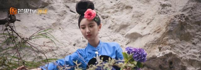 恰好这时候月亮穿着蓝色的民族服饰,头上戴着大红花,手里还拿着紫色的不知名花朵,那不经意间展现出的俏皮模样,真是迷死人不偿命。