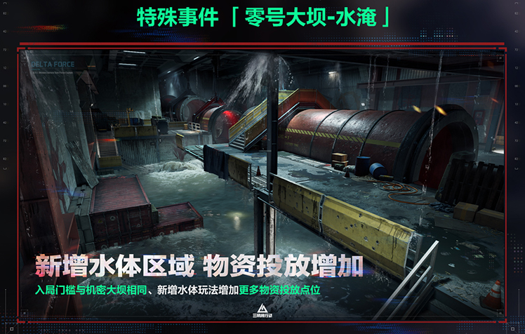 想必大家都有在行政楼猛攻失败,躲入地下无处可逃的经历。在“水淹大坝”中,地下被水淹没后,原先要从另一头刷卡才能单向通过的地下通道,变成了逆向可通行的区域,给行政楼混战的败方一个撤离的机会。