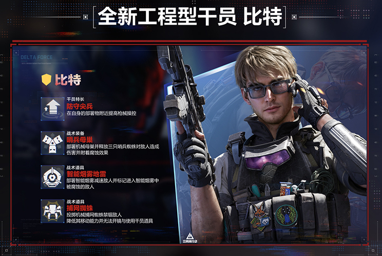 本次也更新了一位新的工程干员“比特”,他的定位比较类似于老黑,技能以哨戒防守为主,两个战术道具以及大招均会在敌人靠近时触发(也可以主动触发)。