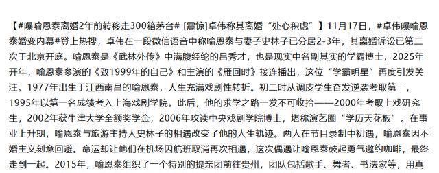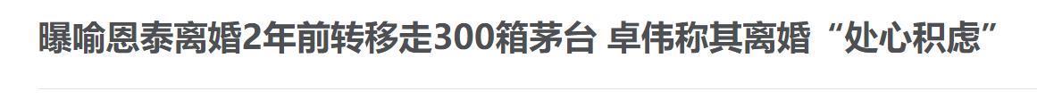 新浪财经, 2025-11-18, 曝喻恩泰离婚2年前转移走300箱茅台 卓伟称其离婚处心积虑