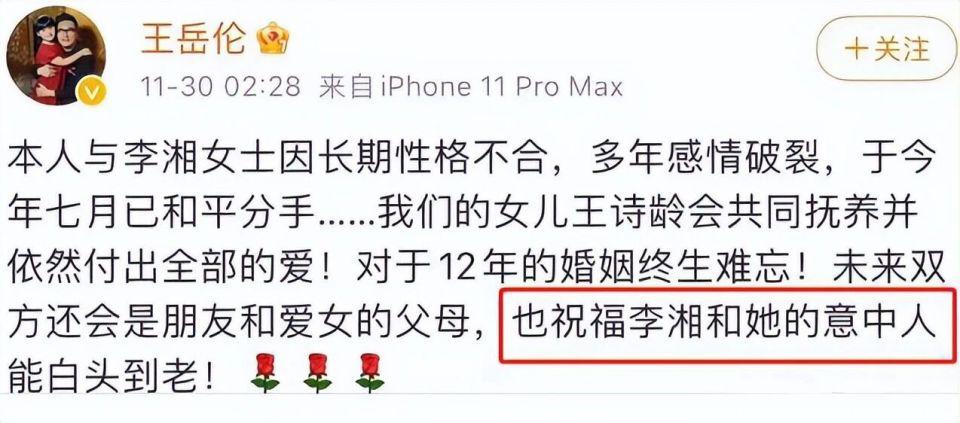 居然是王岳伦先官宣,还在发文中暗讽李湘对婚姻不忠,并且祝李湘跟她的意中人能白头到老。