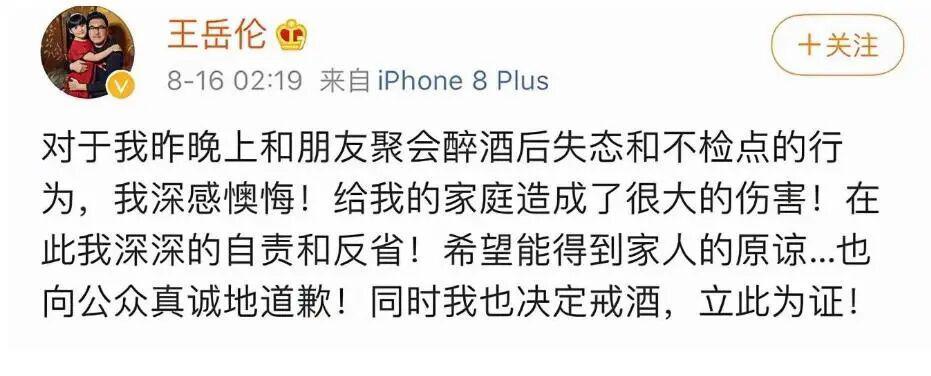 王岳伦依然是第一时间回复,只是因为喝酒失态了,有不检点的行为,很懊悔!此后决定戒酒,立贴为证!