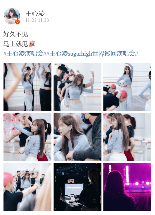 在11月23日,王心凌还在自己的社交平台上晒出了几张美照,并且配文:好久不见,马上就见,晒出的照片都是自己在和同事排练舞蹈的画面,真的是太美了,简单的露脐装已经美得让人挪不开眼了,上衣穿着灰色长裙,配着浅灰色休闲裤,完全看不出43岁的年龄感啊!