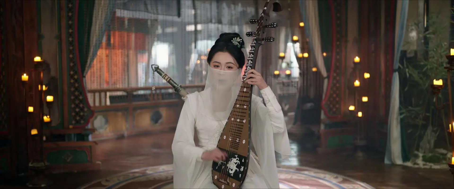 至于饰演奴娇的毛林林,她还没出场之前,就已经有人在发弹幕等她了。毛林林白纱遮面,一手琵琶,一手剑,看到她的模样就想起了那句“犹抱琵琶半遮面”。