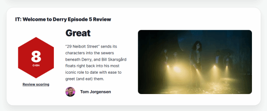 IGN发布了《小丑回魂:欢迎来到德里镇》第五集的评测文章,为该集打出了8分的评价。