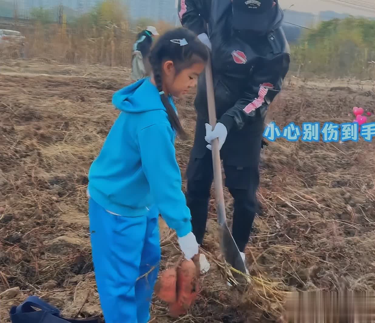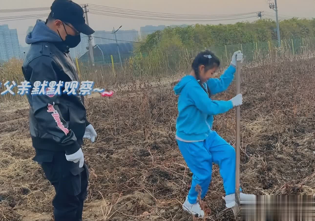 女儿扎着两条麻花辫,穿着一身蓝色休闲套装,她从爸爸的手里拿过铁铲,用力扎到地里。