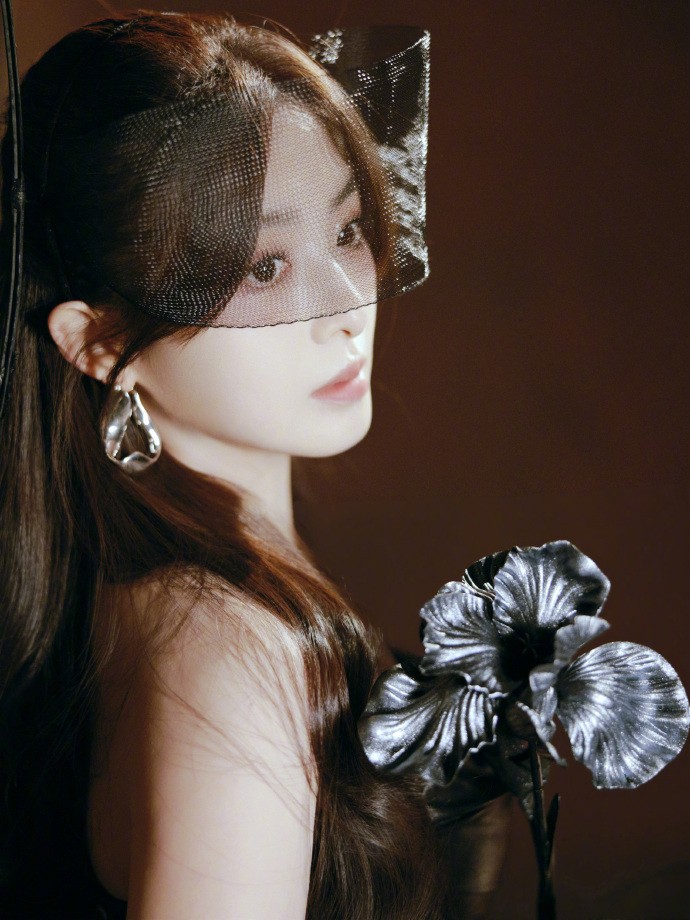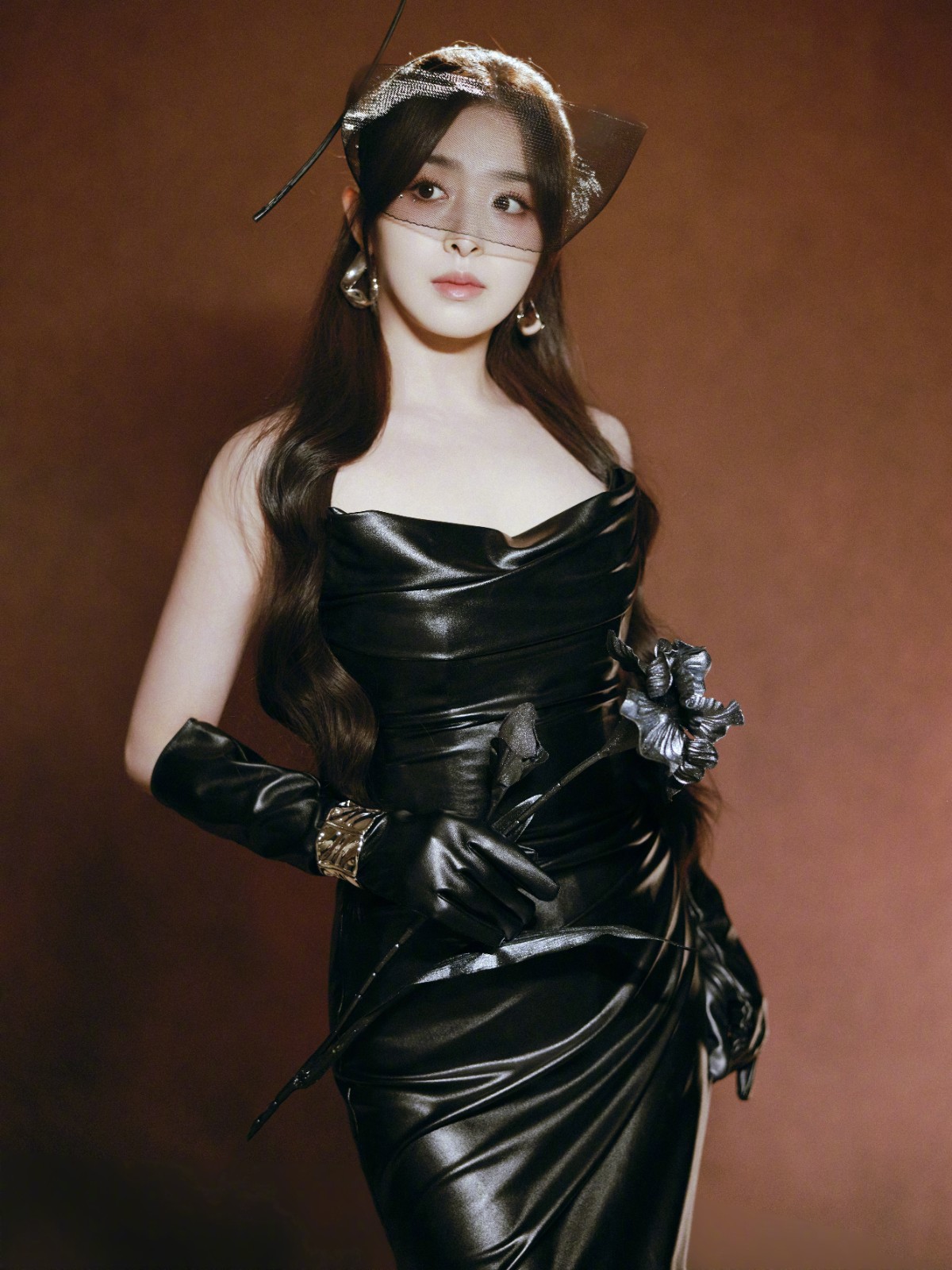 裹身剪裁的黑皮裙勾勒出流畅肩颈线,过肘黑手套包裹着手腕,金属配饰在暗处闪着冷冽的光,和裙面的柔润光泽打了个照面,层次感立马拉满。鬓边一支细巧的黑色头饰半掩眉眼,神秘又克制;指尖轻握的那朵黑玫瑰,简直像在替她悄悄说:‘我依然甜美,只是现在加了点岁月滤镜。’少女的柔软没丢,成熟的锋芒也长出来了,两者混搭得刚刚好,酿出一种只属于她的、甜而不腻的精致。
