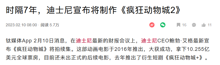 2023年2月10日,迪士尼传奇CEO罗伯特·艾格在最新财报会议当天,宣布《疯狂动物城2》立项。