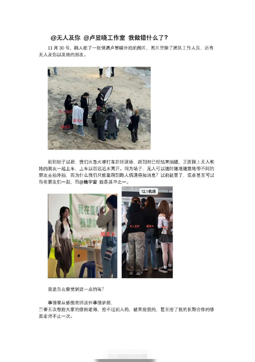 然而,如今她却因工作室的一系列争议事件被推到了风口浪尖。这场风波的导火索是一位名为“无人及你”的站姐的实名指控。这位站姐被曝长期与卢昱晓工作室私联,获取大量非公开行程信息,享受着其他站姐难以企及的特权。在追星的世界里,行程信息就如同宝藏地图,普通站姐往往只能通过路人偶遇等有限途径来得知偶像的动态,而“无人及你”却能直接与团队同乘车辆、同进同出,仿佛拥有了一张“VIP通行证”。