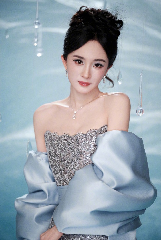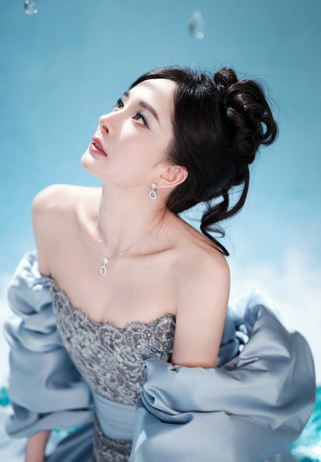 场景更是神来之笔:背景是渐变蓝,空中挂着透明水滴,地面铺着蓝绿色晶体,整个画面就像掉进了梦境水世界。而杨幂站在其中,无论是回眸一瞥还是慵懒倚坐,每个动作都像被精心构图过——不是她在拍照,是画在等她入框。清冷气质与梦幻布景浑然一体,每一帧都能当壁纸。