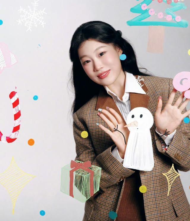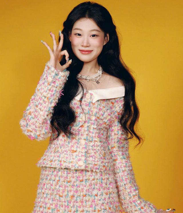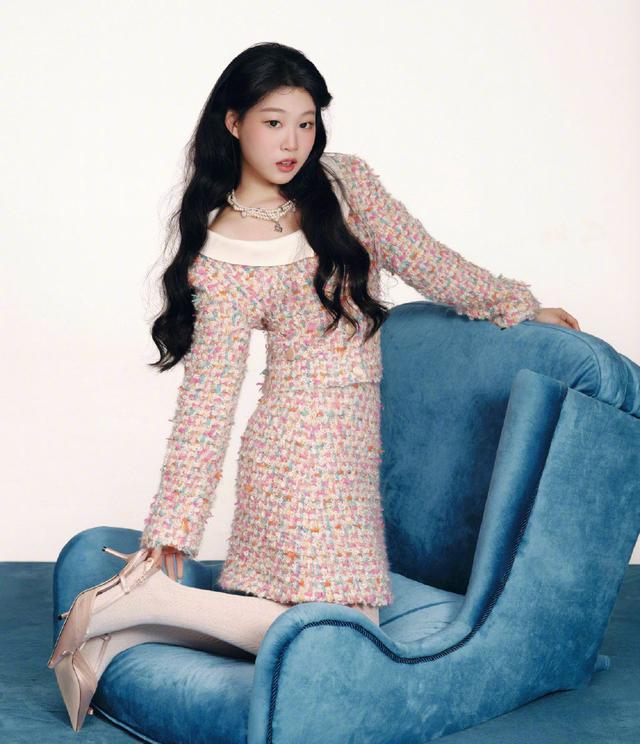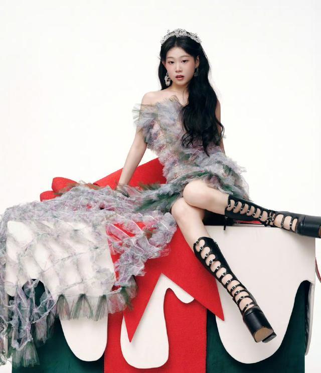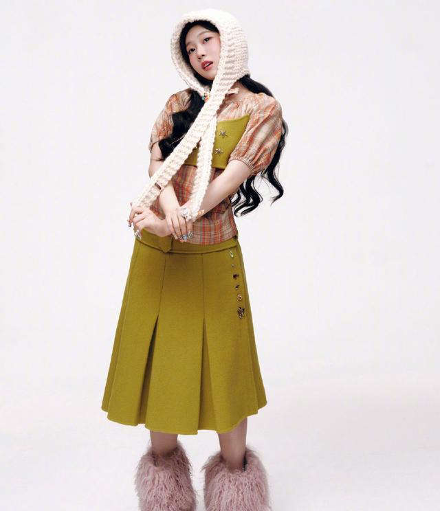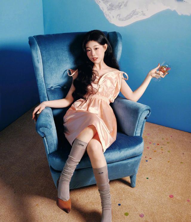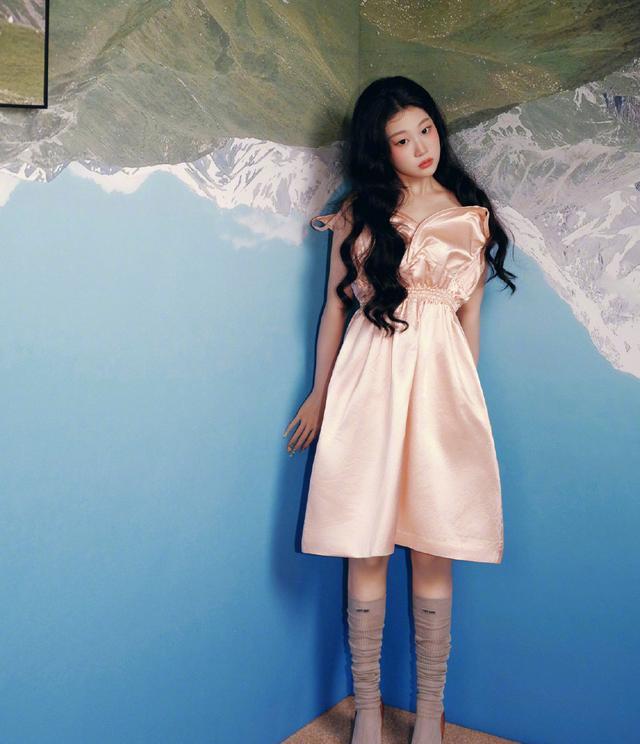 再说回这次拍的封面。除了冰雪感的小香风,她还试了MiuMiu的橘粉色吊带裙,配灰色长筒袜,很有韩系小公主的范儿。网友这回的评论也变了风向,都说她有了自己的特色,看着就讨喜。