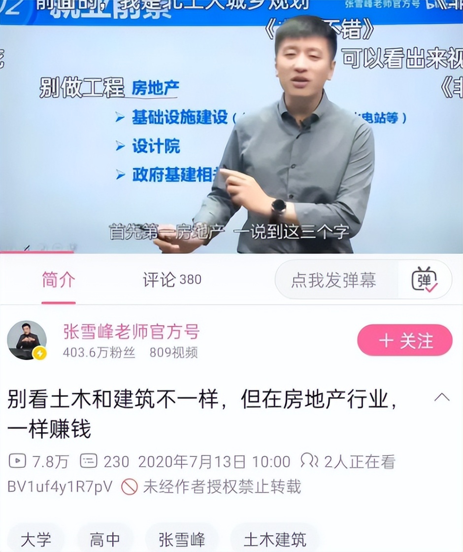 而现在再问张雪峰,他对土木的态度变了个样,连连摇头说“别学”,还时不时调侃“土木就是扛钢筋”。
