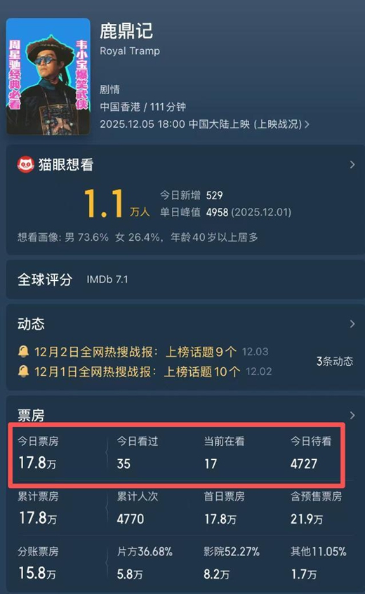 首日票房数据一出来,简直让人惊掉下巴,仅17.8万元!排片占比也只有可怜的1.1%,在4800多场放映的情况下,累计观影人数才4770人。这数字,和去年《食神》重映644万票房相比,连个零头都不到。更惨的是,还被同期上映、单日票房近2亿的《疯狂动物城2》彻底碾压,就像一个武林高手被初出茅庐的小辈打得毫无还手之力。