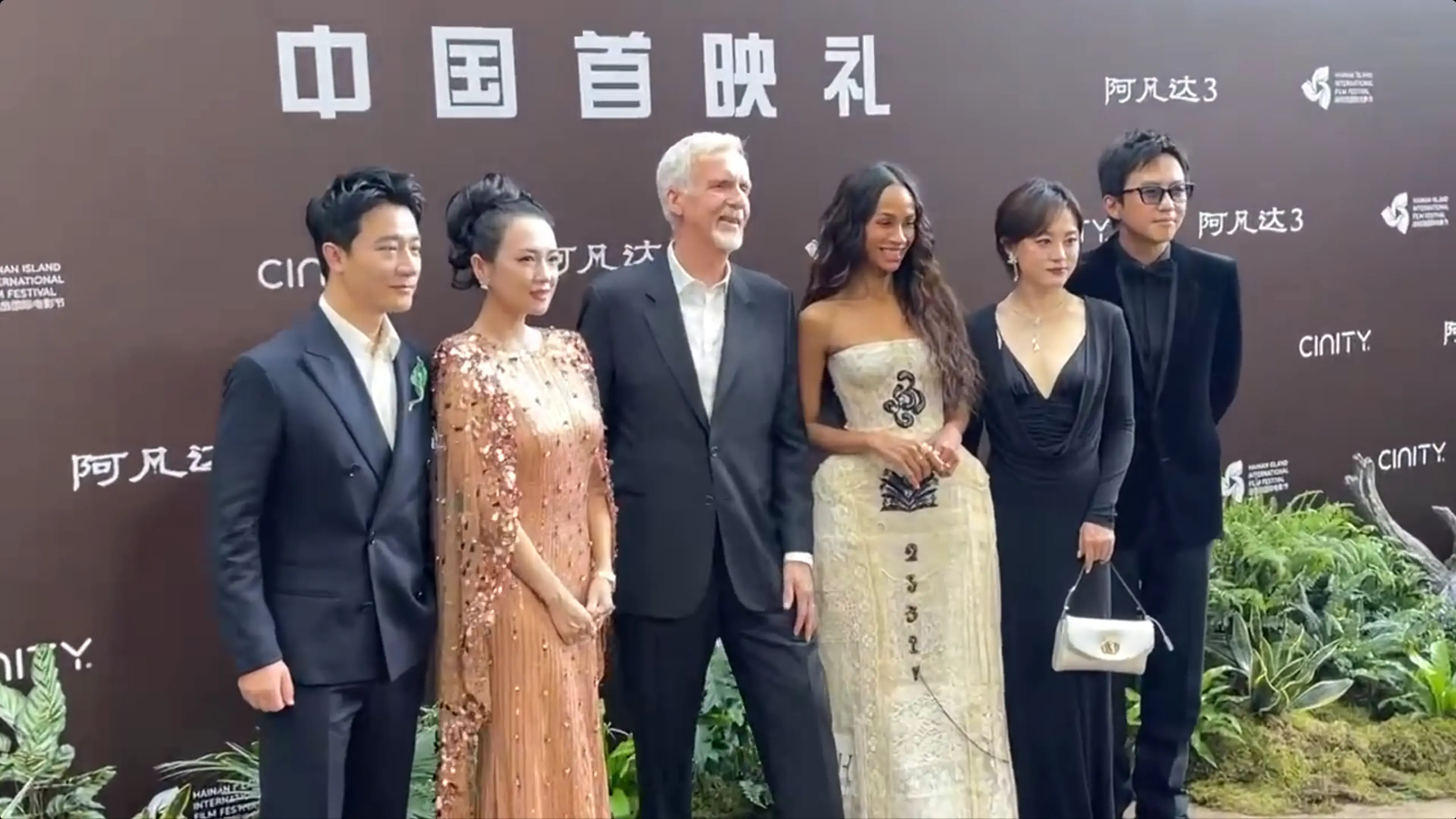 首映礼开始前,户外背景板的合影,同样保持相同的位置,只不过一共六个人,就是卡梅隆和佐伊居中C位,不过我相信,如果再多来一个国内的配音演员,肯定也是站在黄轩旁边,形成卡梅隆C位,佐伊和章子怡站在左右的格局。