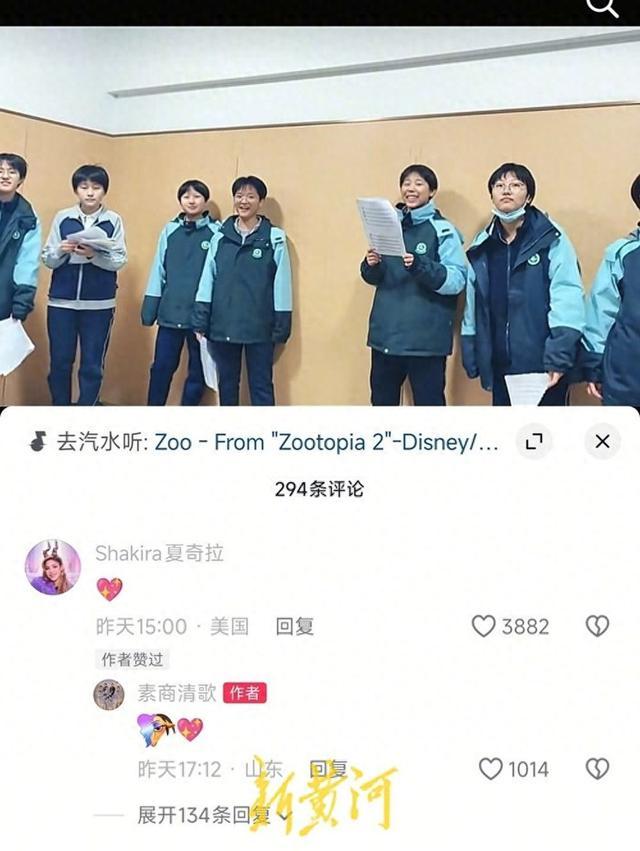 镜头前,十余名身着校服的学生围成半圆,人声交织起伏,演绎着电影《疯狂动物城2》的主题曲《Zoo》。在互联网的另一端,一位特殊的观众在留言区留下了一颗“爱心”。她是歌曲的原唱者、拉丁天后夏奇拉。
