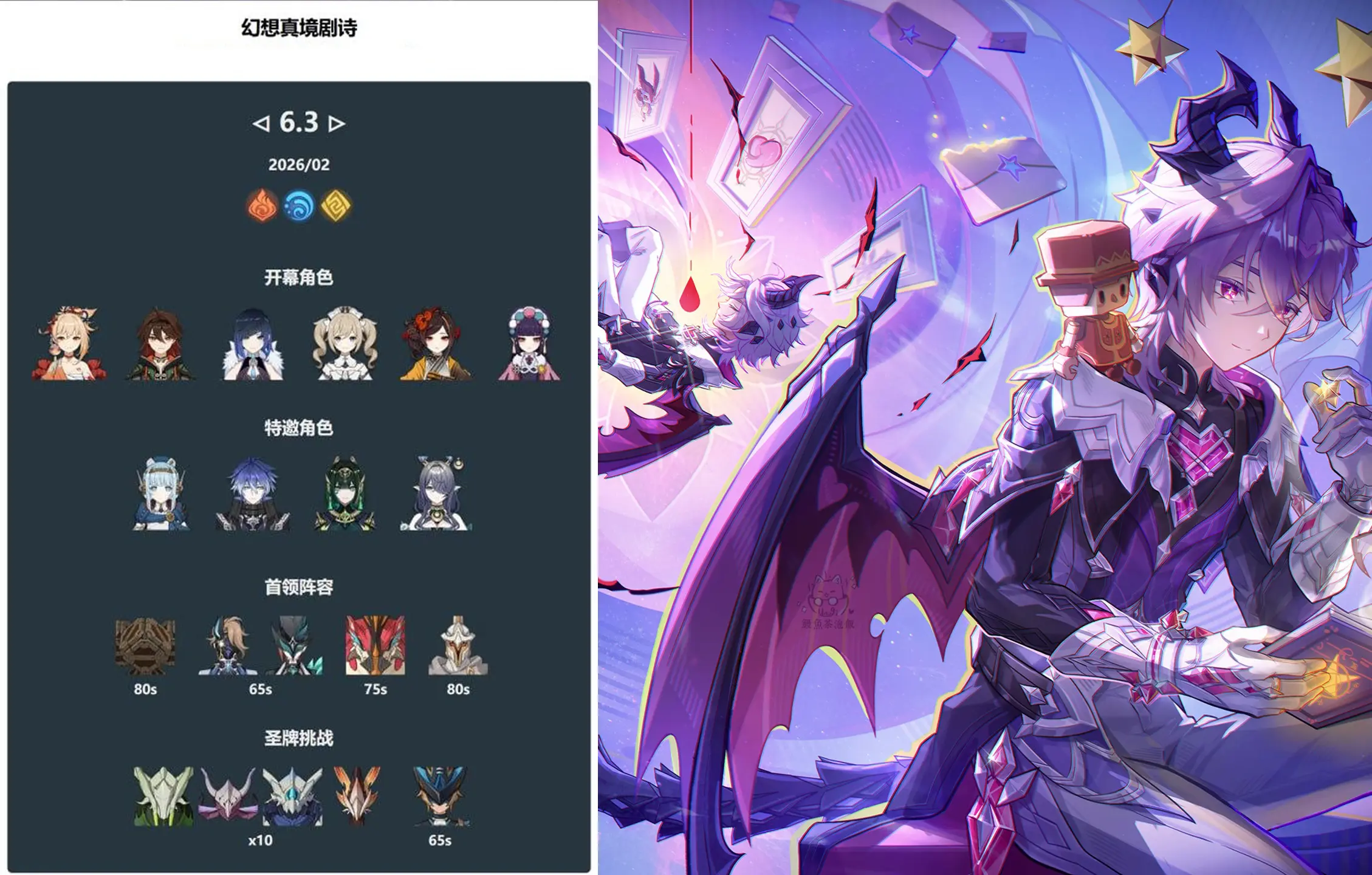 同时,原神6.3版本的幻想真境剧诗阵容也正式公布了!千织开幕不错,毕竟持有率特低!有意思的是这挪德卡莱的特邀f4居然齐齐整整的出现了,而且霄宫和这十只圣骸兽同场出现,设计的时候策划不会笑出声吗?