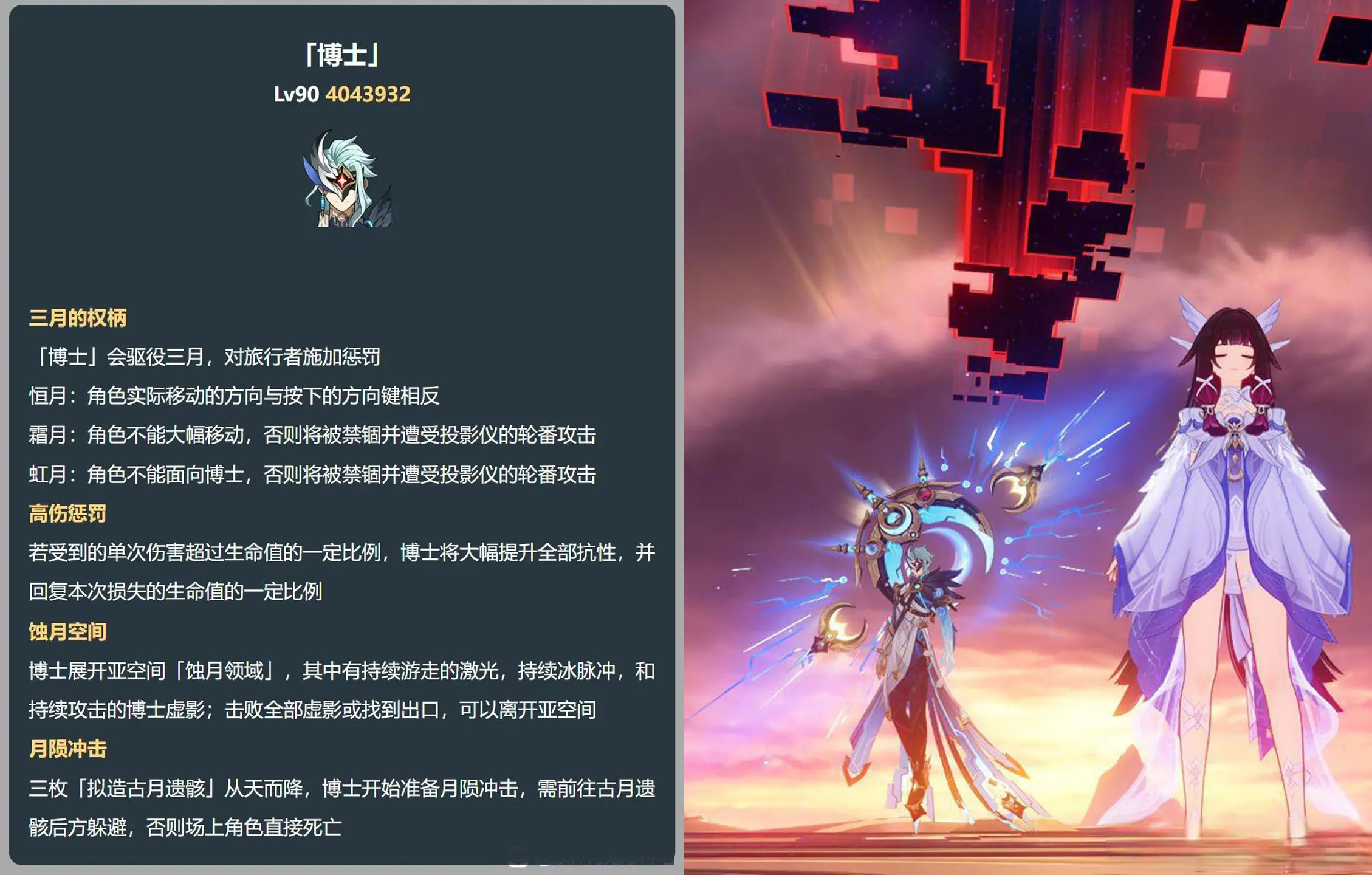 另外,博士周本的技能方式也有了,从中可以很清楚的看出这次是高火抗+高伤惩罚把火神防出去了!至于有玩家抱怨说太难的,其实反方向其实还好,以前打mmo就有这种机制,多打两次习惯了就好,大家也可以选择钟离加三个挂件直接挂机,反正只要不锁血都是好周本!