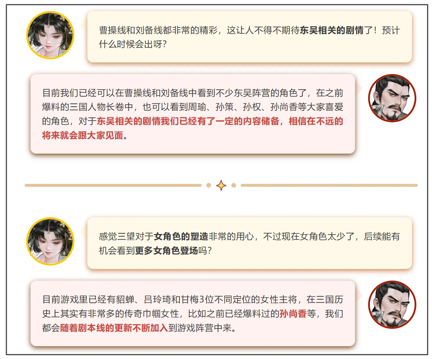 这才一个多月,《三国望神州》就端上了大型版本,而据策划透露,未来还有更多内容都在准备中。例如,曹操线和刘备线剧情十分精彩,让玩家不得不期待东吴线了,官方也表示:加紧制作中;而且随着东吴线的推进,孙尚香等女将也会一一闪亮登场。