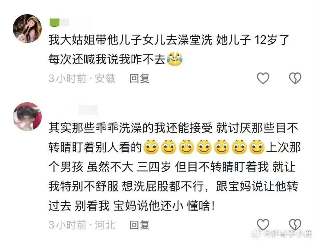 我的朋友@小白 就曾在公共澡堂碰到过一直盯着她看的小男孩;