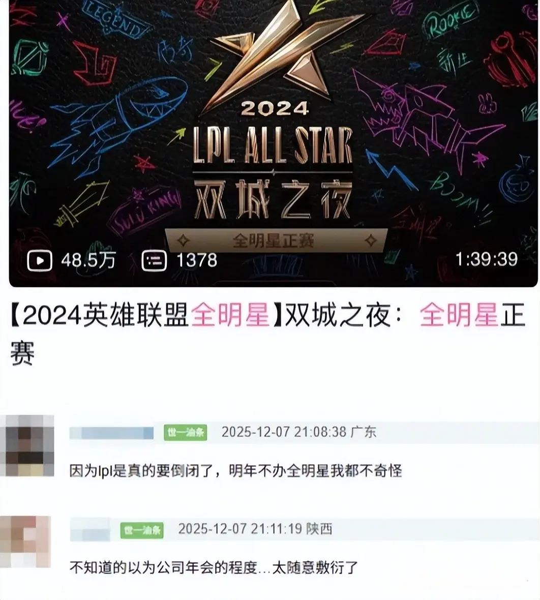 LPL热度出现严重下滑,全明星赛无人关注,播放量仅有25万,2025年LPL全明星赛的数据出炉,却让很多人看得心凉不已根据B站赛事官方号统计,今年正赛播放量只有区区25万,回顾过去两年,2023年高达175万,2024年下滑到48万,而到了今年直接“地心探险式”暴跌,让不少网友直呼:“这届全明星,观看人数怕不是凑数的。”