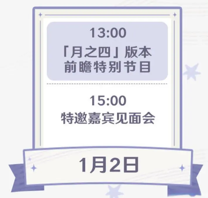 各位旅行者好,这里是有点靠谱的原魔姬!真没想到,原神6.3版本前瞻时间提前了!已调整为1月2日的13点,除了线下外,还将会在「原神☆FES」上播出,到时候别提有多热闹。其实官方早在5.0版本即将开启的时候,前瞻直播也做过一次调整,同样也是双线更新。很明显,官方对于这一次的月之四版本非常重视。那么都有哪些看点,继续往下看。