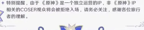 在这里还有一个特别提醒,由于《原神》是一个独立运营的IP,非此IP相关的coser观众将会被拒绝入场,这样就会导致不能在第一时间看到前瞻直播,以及影响自己的游玩体验,所以还是需要各位旅行者多多注意一下的。