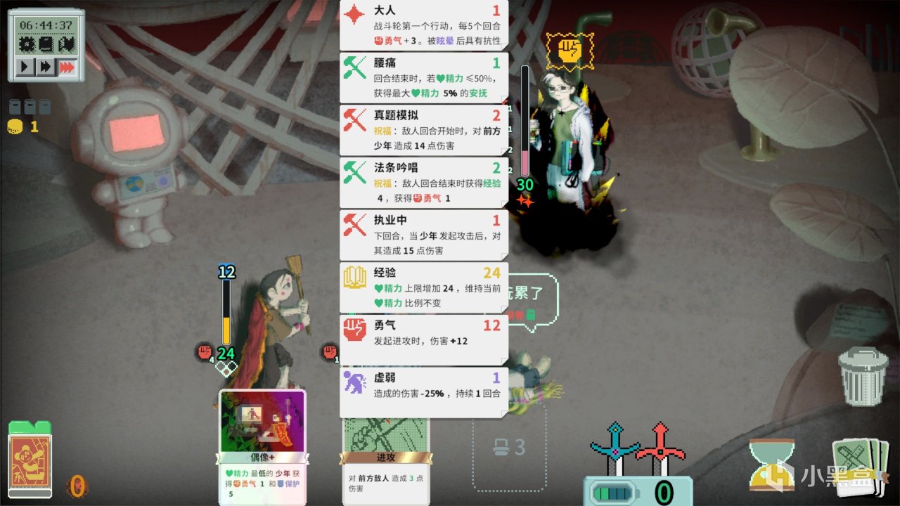 本作我们三位角色每人每回合有一张可打的牌,你约等于可以认为是团队只有AP1,此外有一个“电量”的设定,积累满了可以增加1AP(可以蓄着不用),当然对应的敌人(主要是BOSS)也有减少电量的技能,甚至能让你直接无法行动。