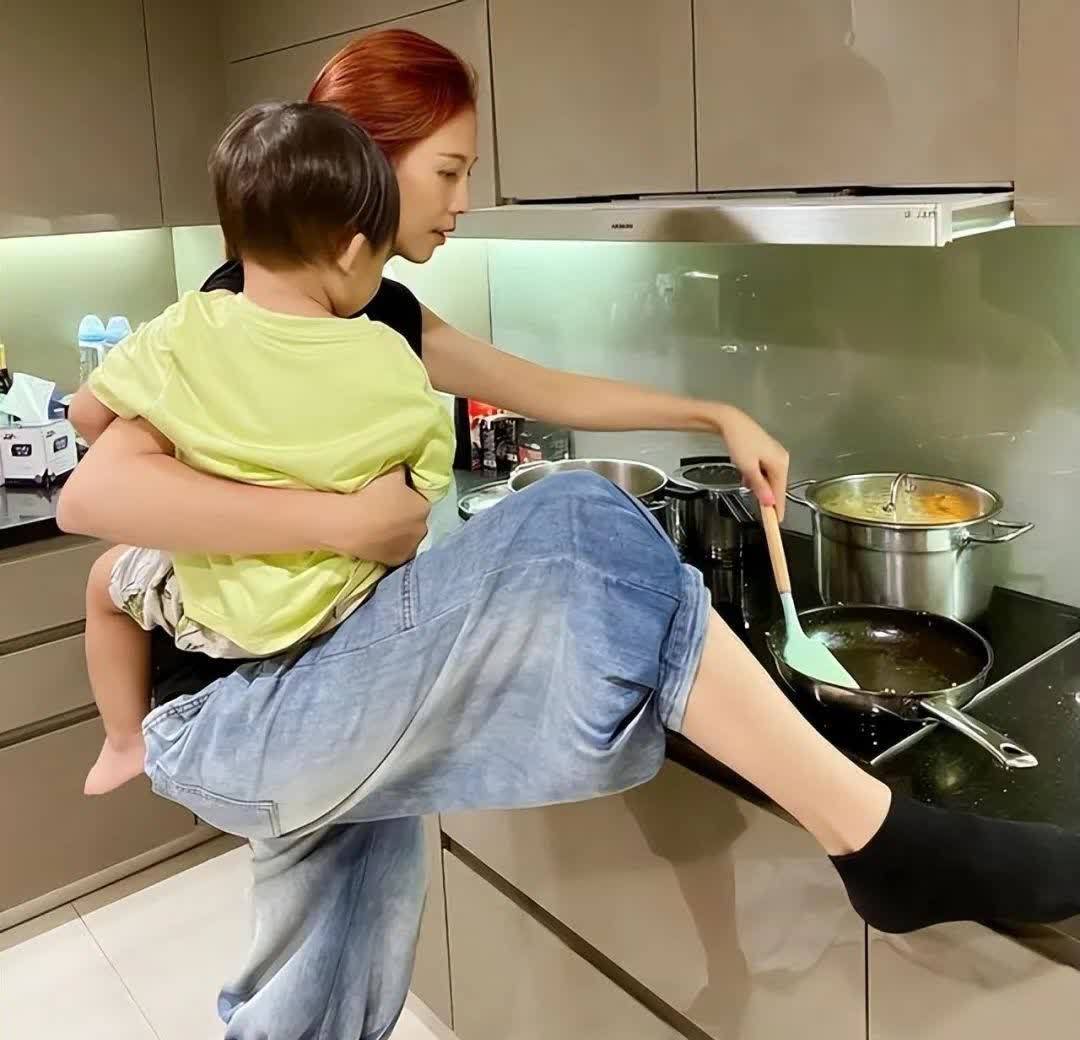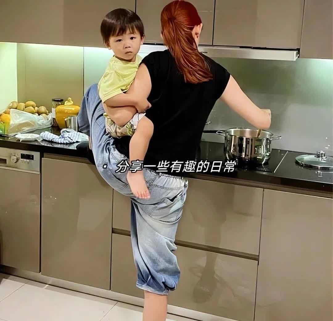 蔡少芬平时要一个人照顾三个孩子,忙起来的时候,经常一边抱着娃一边做饭。