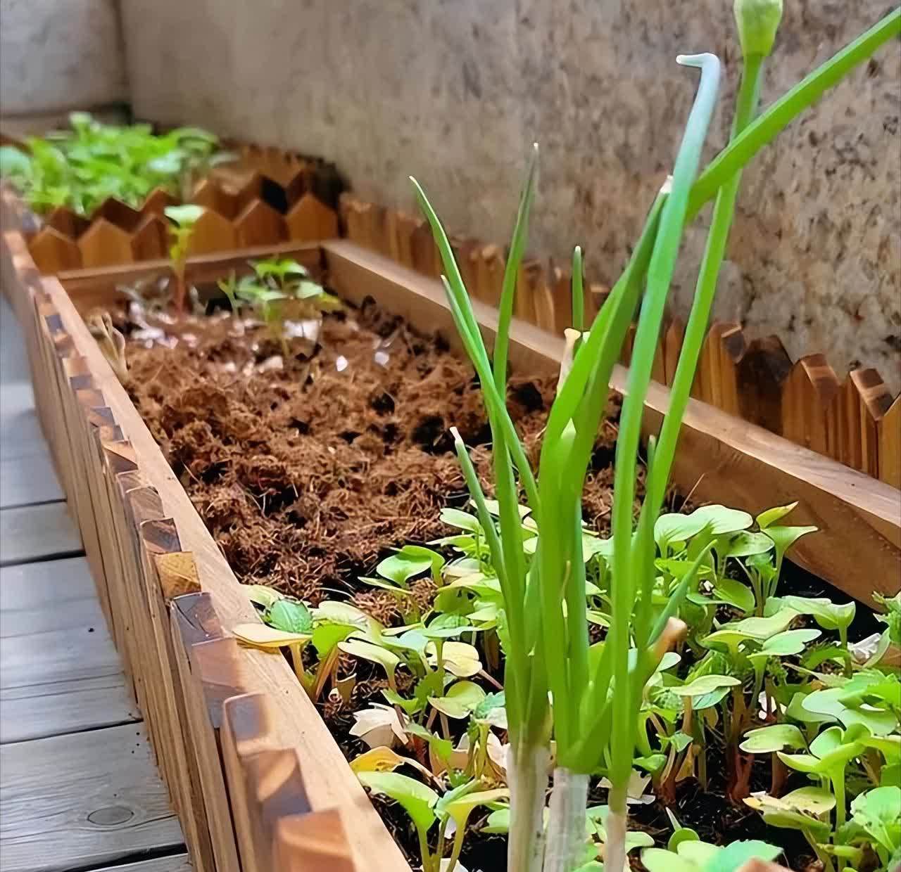 露台右边有一小片花圃,空着可惜,她就种了些蔬菜,比如香菜、小葱、辣椒、小白菜等等。