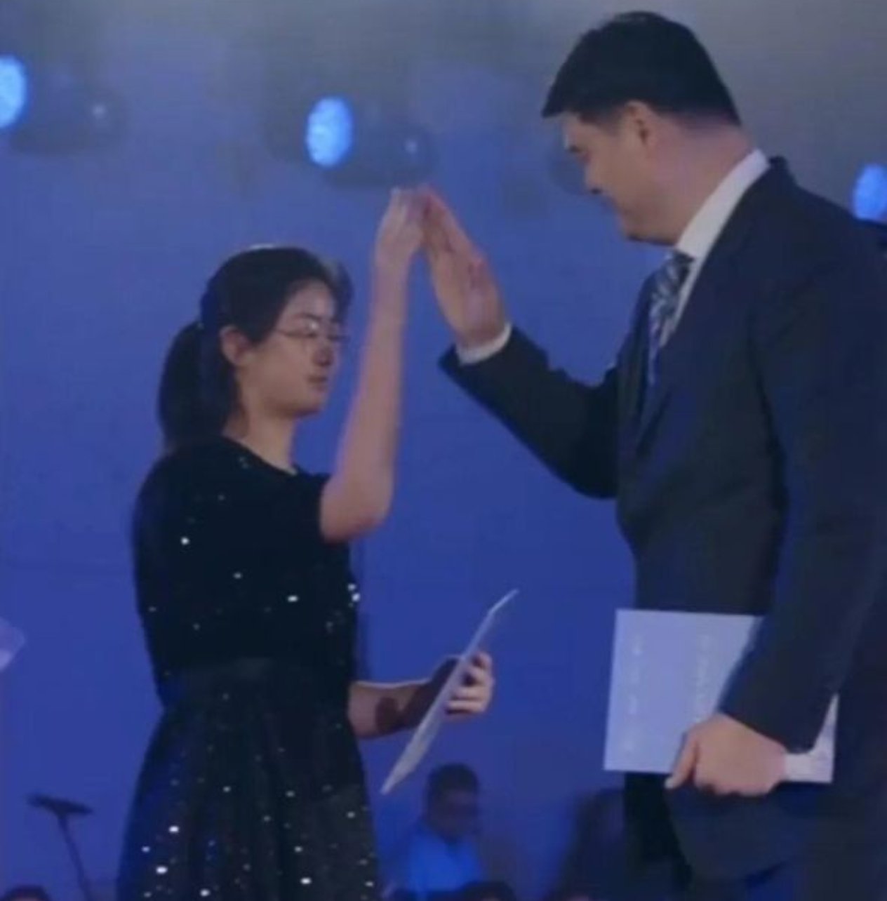 晚宴中,她为父亲姚明提供了流畅的英语翻译服务,全程表现沉稳自信,毫不怯场。姚明在女儿翻译时眼中充满宠溺与骄傲,发言结束后父女二人温馨击掌,互动融洽。据悉,姚沁蕾出生于2010年,父亲姚明身高2.26米,母亲叶莉身高1.9米,其身高发展一直备受公众关注。