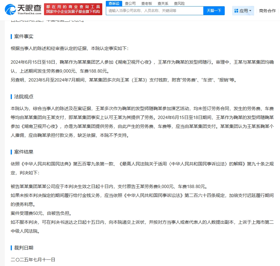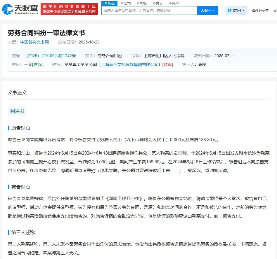 天眼查天眼风险信息显示,近期,法院公开王某与上海丝芭文化传媒集团有限公司劳务合同纠纷裁判文书。原告王某诉称于2024年6月15日至6月18日受被告聘请担任其公司艺人鞠婧祎的发型师,为其参加的活动做发型。工作结束后,被告迟迟不向原告支付劳务费,多次协商无果,沟通期间态度恶劣(拉黑失联,去公司讨要说法被赶出来),故起诉。