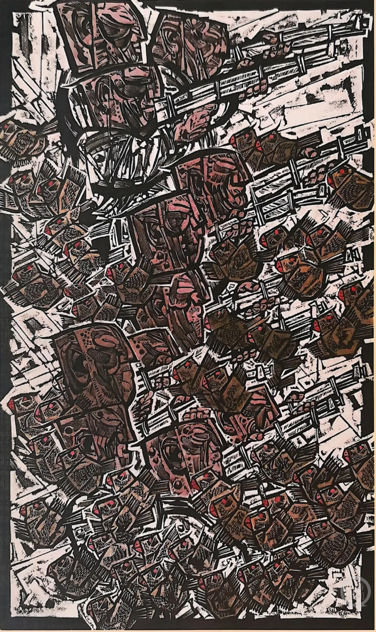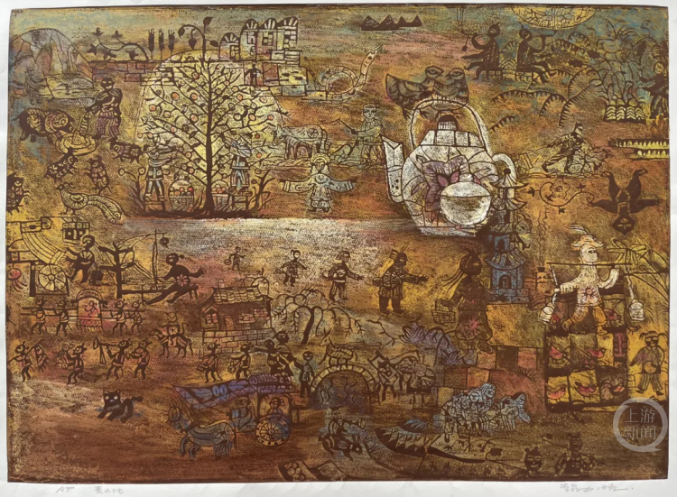 展览中,有著名版画家代大权带来的《动静之间》,也有重庆本土艺术家李毅力创作的《黄土地》等。此外,彼时年仅12岁的陈荣荣于上世纪80年代创作的《出黑板报》,以及13岁的喻小凡带来的《艺术之光——重庆大足石刻》等作品,也吸引了诸多目光。丰富多彩的校园日常,满满都是烟火气的田间劳作、枣乡丰收等都被孩子们记录了下来,版画特有的质感更为这些幸福点滴增添了特殊的意蕴。