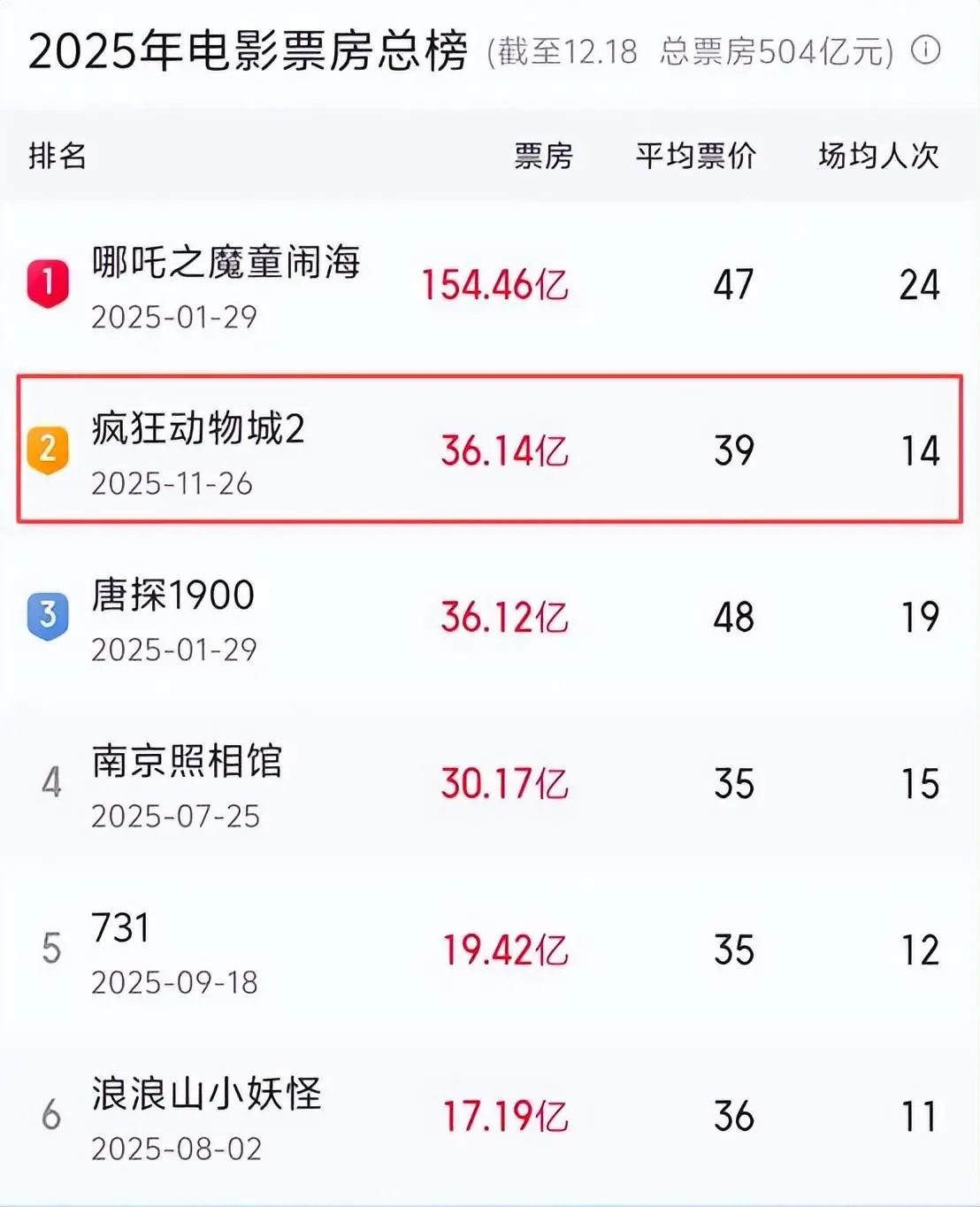 面对即将到来的一场票房恶战,《疯狂动物城2》赶在《阿凡达3》上映前,斩获了36.14亿票房,将《唐探1900》赶下亚军宝座,仅次于《哪吒之魔童闹海》。