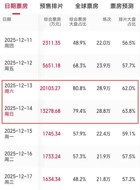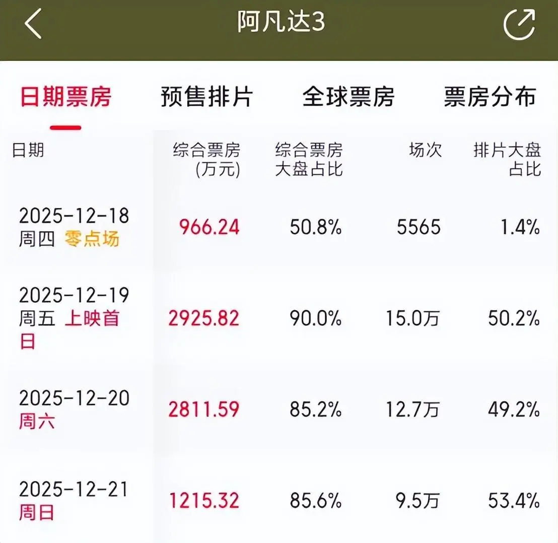 电影票房的蛋糕只有这么大,如果《阿凡达3》的口碑持续走高,也将锁定占比更高的排片,迎来票房爆发。