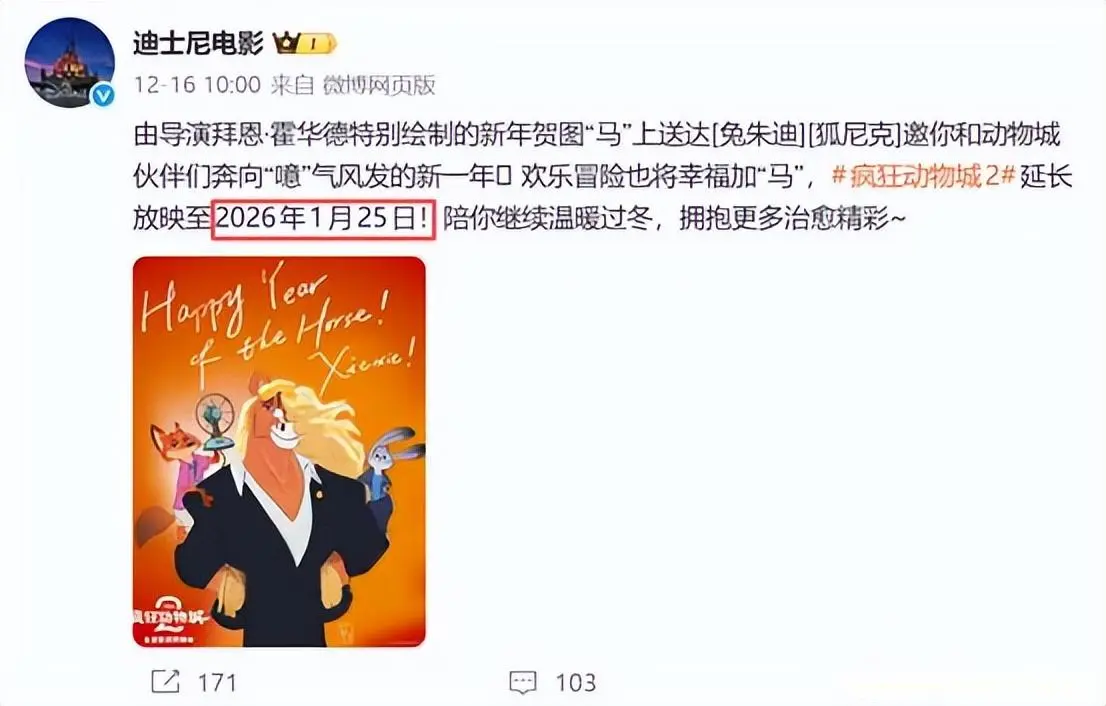 《疯狂动物城2》已经宣布延长上映日期到2026年1月25日,片方对这部电影的长尾效应相当自信。