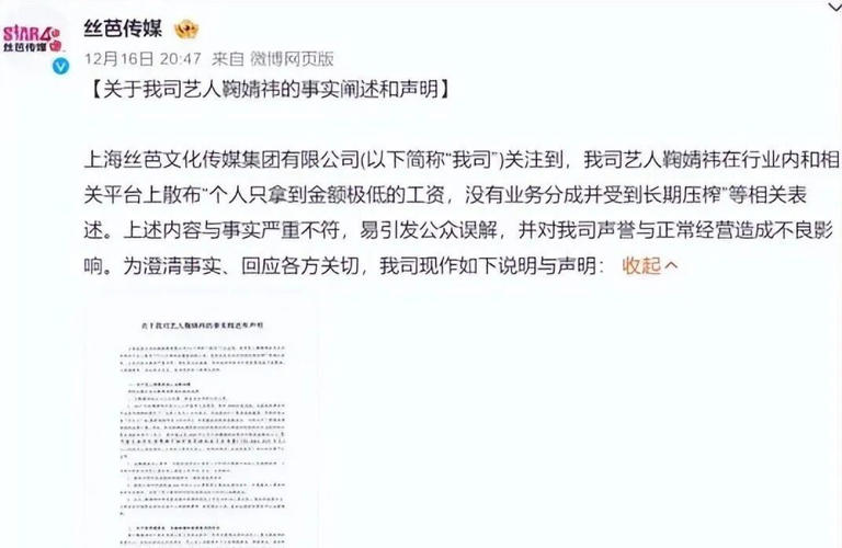 12月16日,丝芭传媒通过社交平台发布声明,称鞠婧祎工作室刻意引导粉丝传播“公司压榨员工”的不实信息,并公开了鞠婧祎的薪资明细,同时明确双方经纪合约将持续至2033年。