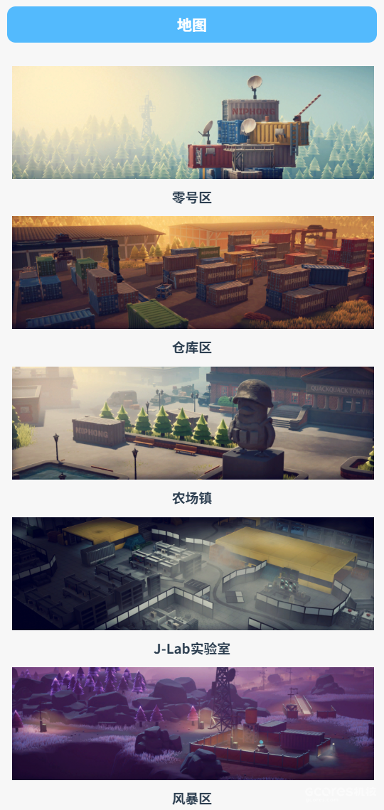 在游戏中,我们将扮演可爱的憨厚的鸭子,在逐步探索出的五张地图中进行游玩,分别是:零号区,仓库区,农场镇,实验室1层(JLab1层),实验室2层(JLab2层)。