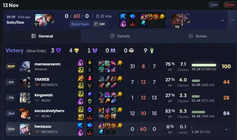 此外,这个网站还记录了一场长达131分钟的欧服黑铁4排位对局。其中一方玩家使用赛娜打出了超过72万伤害,取得53次击杀和59次助攻,帮助队伍获胜,这也成为2025年全球《英雄联盟》排位赛中单场最高伤害记录。值得一提的是,这场超过两个小时的史诗大战中,双方团队总击杀数均超过100,堪称一场大乱斗。游戏后期,赛娜凭借其无限成长的特性,在超远距离制造伤害的能力确实令人惊叹。
